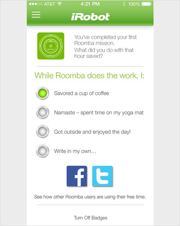 Early in my career at iRobot, I provided design support to the App team by offering logo creative explorations, social badge concepts, and user experience feedback on the home robots app.