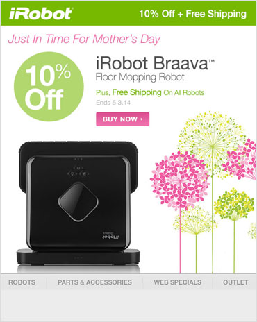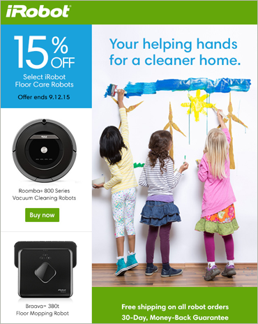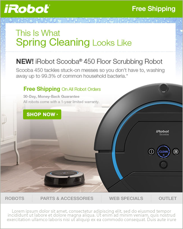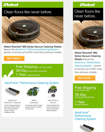 Before iRobot transitioned to responsive emails, single image emails were common practice. In this design I wrote the copy as well as created the design showing depth for interest. The in-setting image with the hero shot in the forefront is strategic to show detail and context.