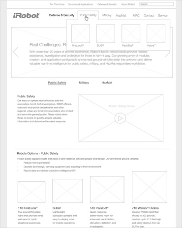 Having complex robot features and very specific customers including Military and Public Safety Providers, this wire frame was designed to give visibility into how these specialized robots would be presented within an ecommerce-focussed site format.