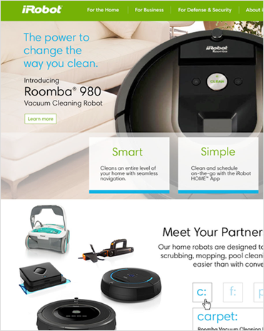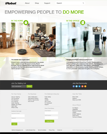 read moreiRobot was undergoing a brand identity change. Three distinct business units were to be showcased on the home page. Each standing on its' own yet not in competition with the other. It was a delicate balance to keep each internal business team happy with their representation on the page.