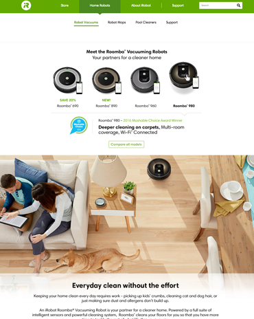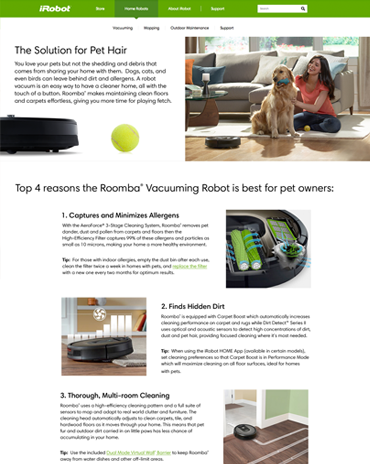 While at iRobot, I championed an initiative to conduct User Experience studies to better understand our customer's behavior on key web pages. It had been over two years since iRobot had done any such studies. By using the web service UserTesting, I learned what our customers were experiencing on the site and I created designs which effectively solved for specific user challenges. iRobot has since launched a wide-reaching initiative to continuously test and study the site going forward.